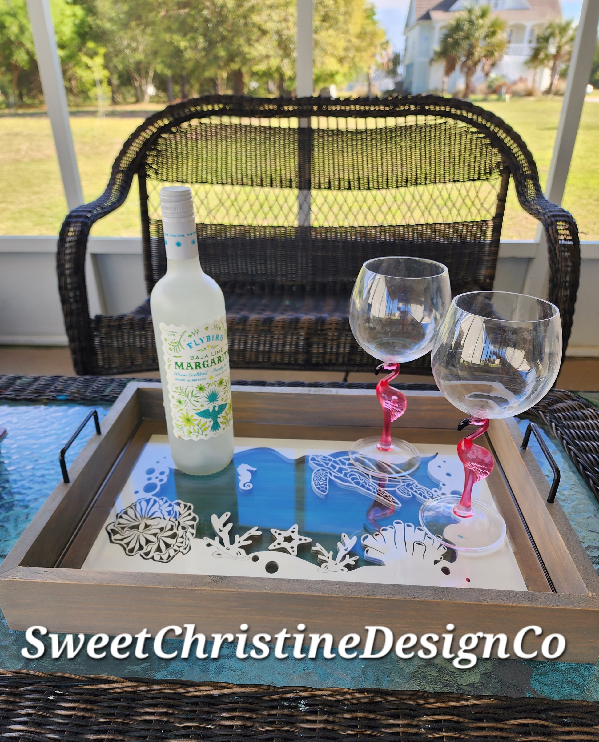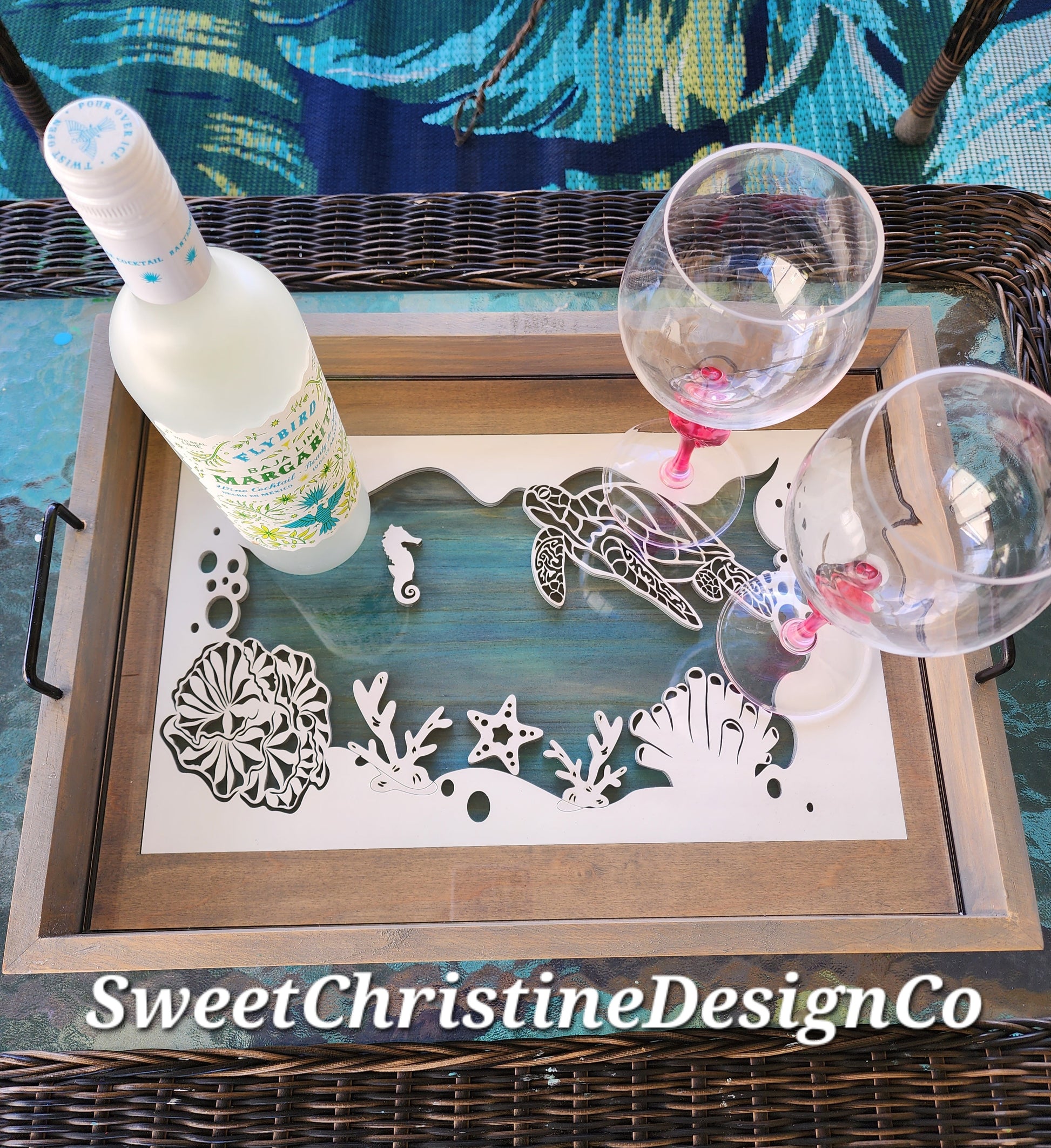 Serving tray with light gray stain and sea turtle design in white. Water color in beautiful sea tones make the backdrop for the sea turtle design set into the bottom of the tray. 1/4 inch clear floating acrylic protects the design but is also removable for easy cleaning.