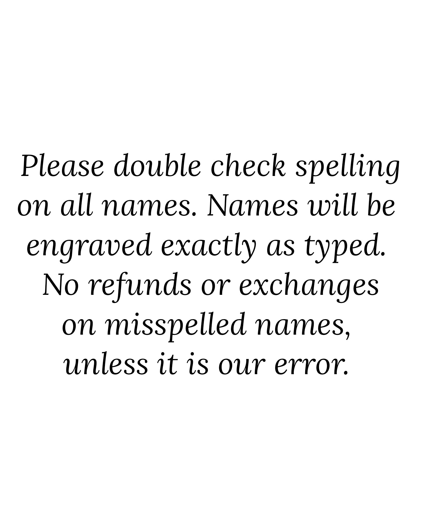 Please double check spelling on all names. Names will be engraved exactly as entered on order. No refunds or exchanges for misspelled names unless it is our error. Gingerbread people can be made with or without bow on the head. Please indicate "bow" or "no bow" for each name. Also indicate "cat" or "dog" if including pets.
