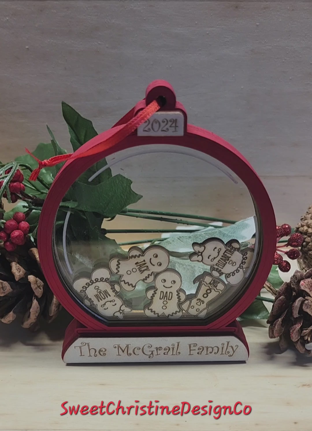 Adorable "snowglobe" ornament with personalized gingerbread people. Each gingerbread person is personalized with a family member's name. Gingerbread dog or cat also available! Figures come with or without bow on head. Please indicate your preference in the form. Gently shake the ornament to make them move inside the "snowglobe". Max of 8 gingerbread people per snowglobe. Need more figures inside? Please email me for custom inquiries. SweetChristineDesignCo@gmail.com
