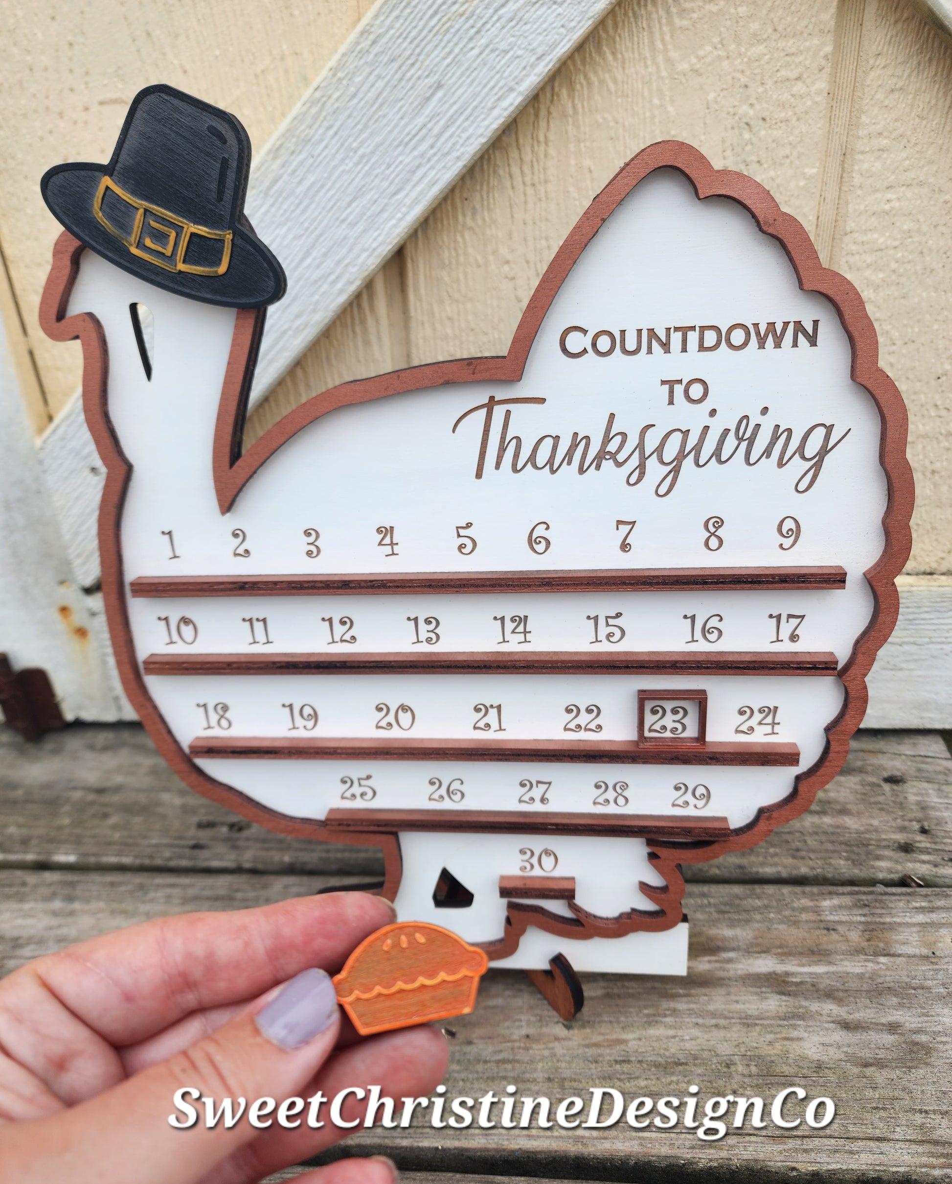 Countdown to Thanksgiving with this fun calendar! Turkey shaped with fun pilgrim hat detail. Small pumpkin pie token counts down the days. Use the small wooden square to mark the Thanksgiving date. Comes with display easel. Made from maple plywood.