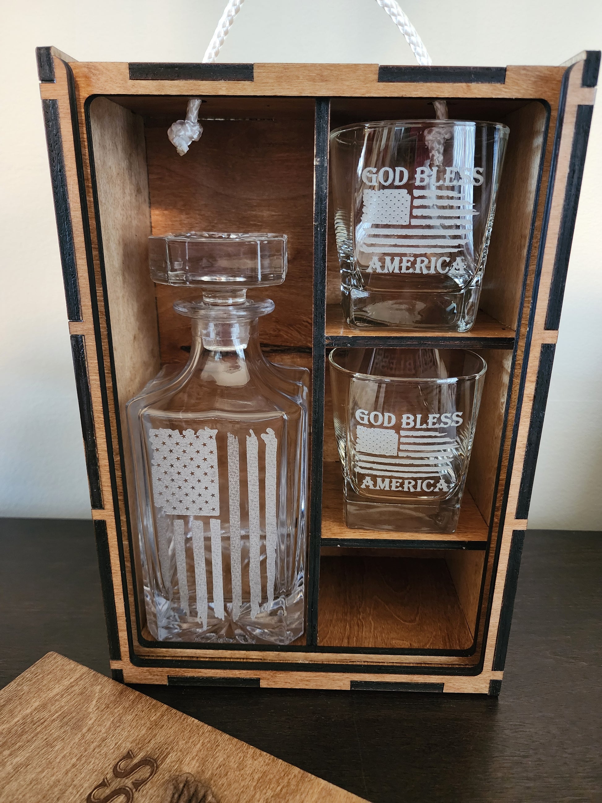 Whiskey decanter set comes with glass decanter, two glasses, and beautiful box. Distressed American flag design on decanter and glasses. Bald eagle and God Bless America design on box. Looking for a custom box? Please email me at SweetChristineDesignCo@gmail.com